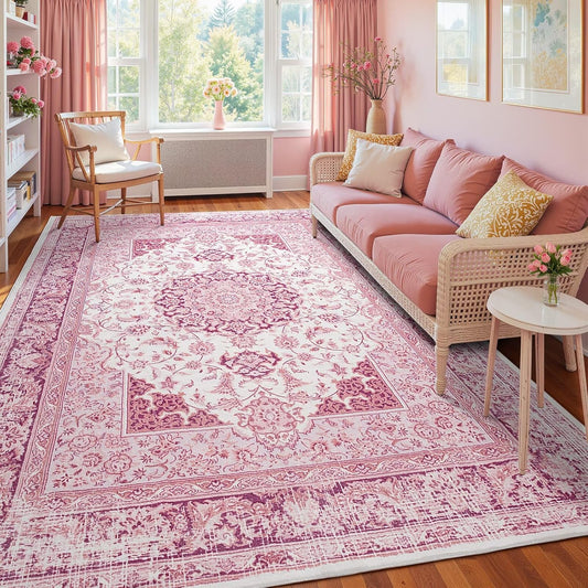 5x7 Bright Pink Area Rug for Living Room, Machine Washable Rugs with Non-Slip Backing for Girls Bedroom, Cute Vintage Carpet for Kitchen Laundry Kids Room